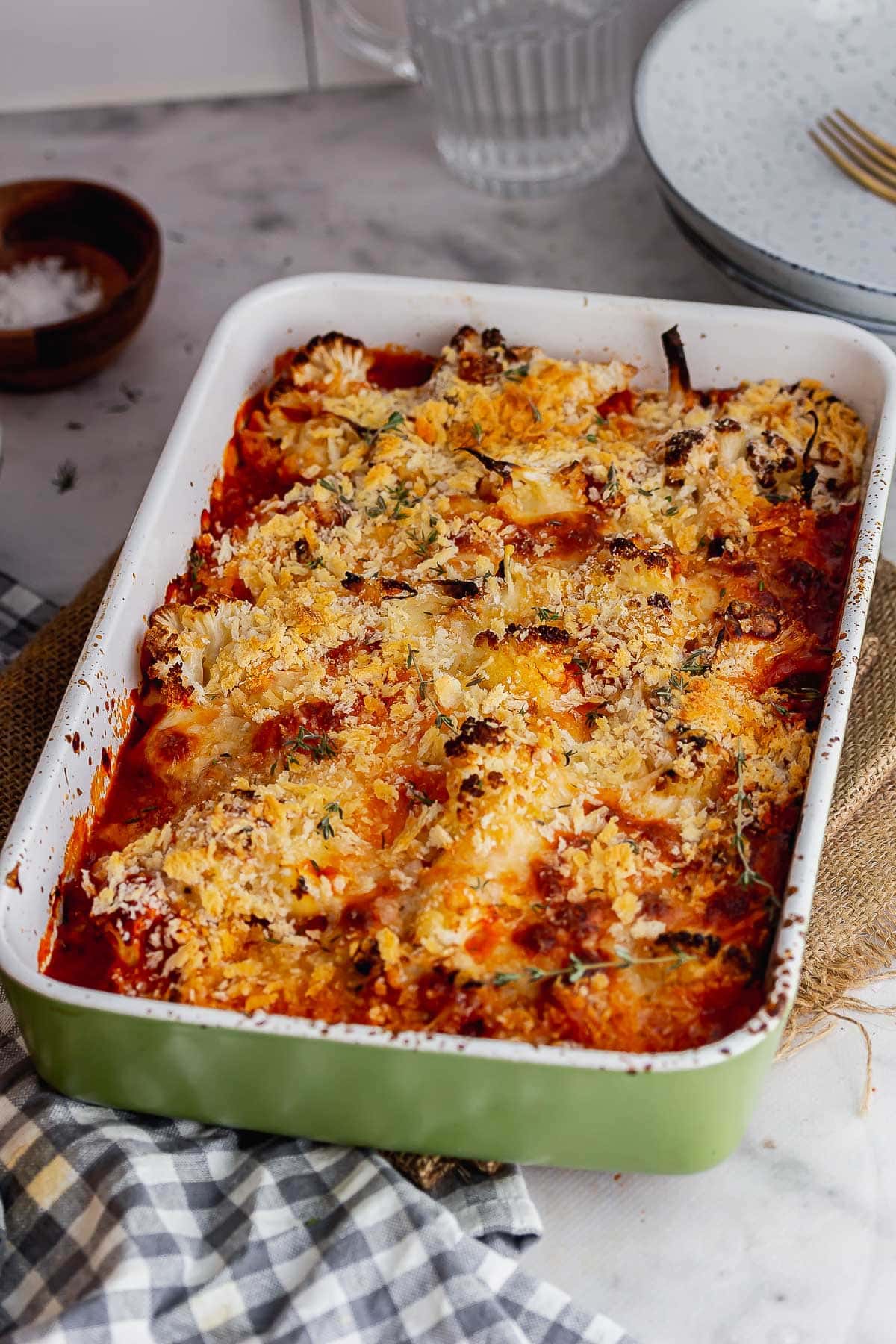 This hearty cauliflower bake recipe from our food recovery partner Epic-Cure layers roasted vegetables, rich tomato, and melted cheese for a simple, comforting dish.